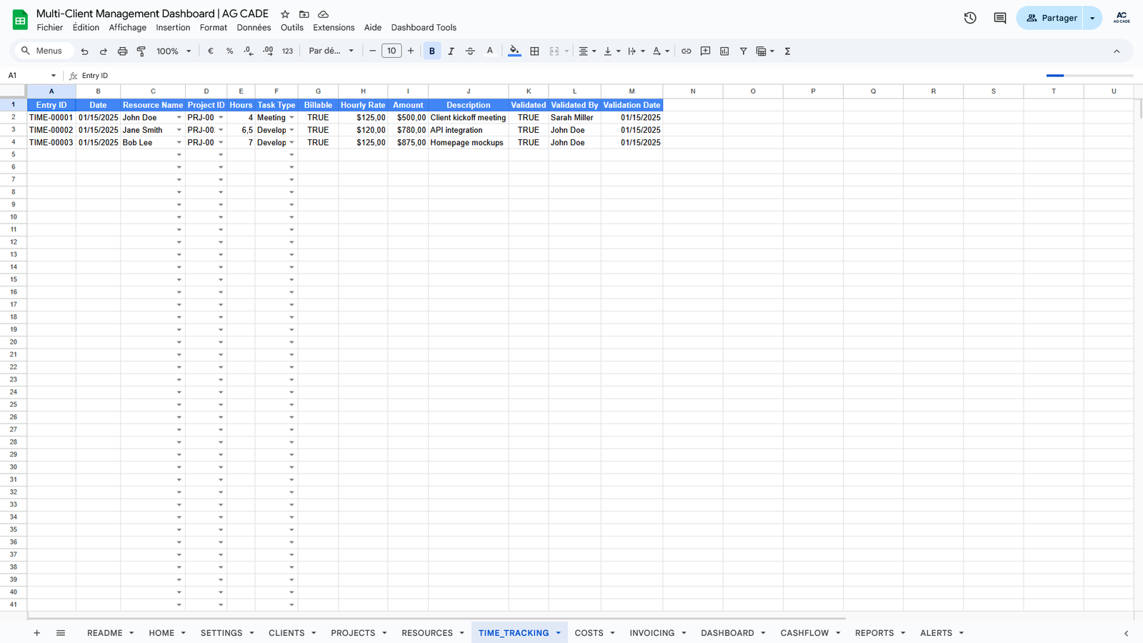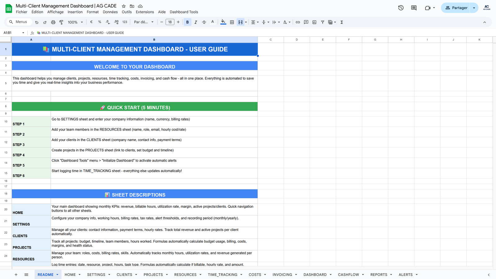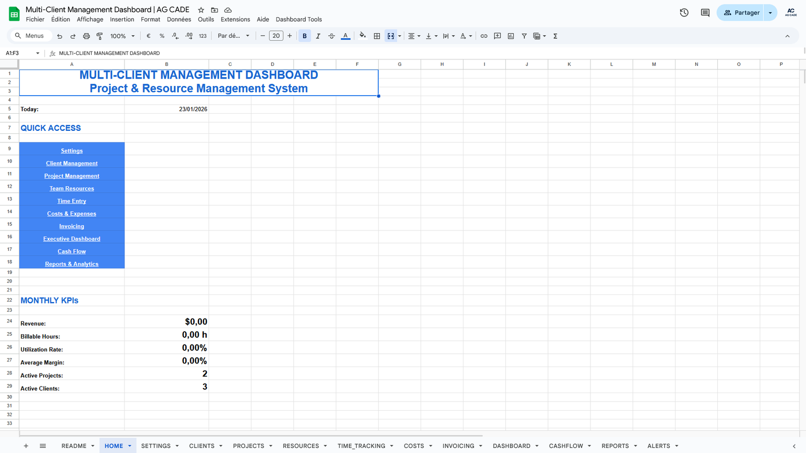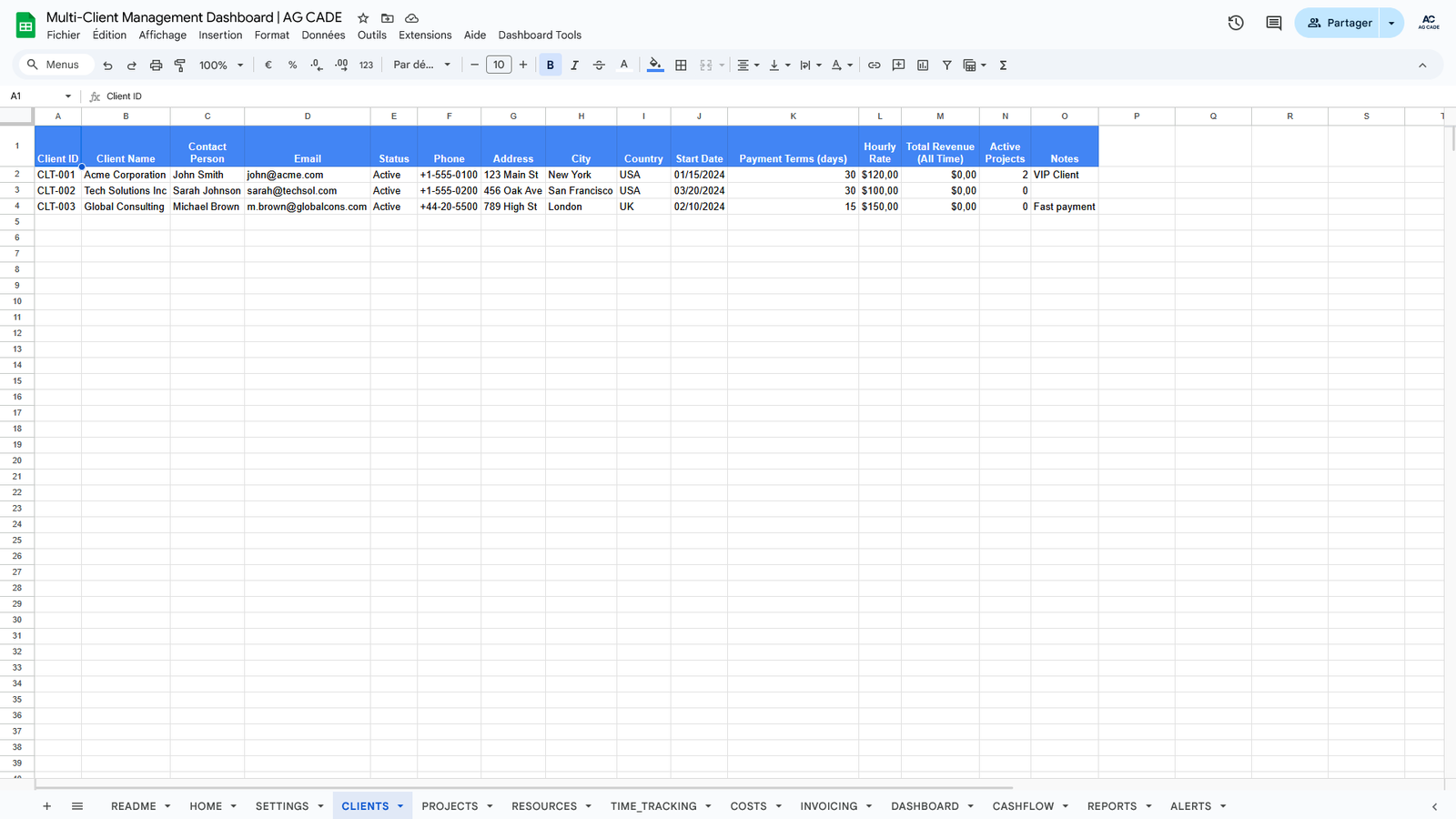 Complete business management system for agencies and consultants. Track clients, projects, time, invoicing, and cash flow - all automated in Google Sheets.