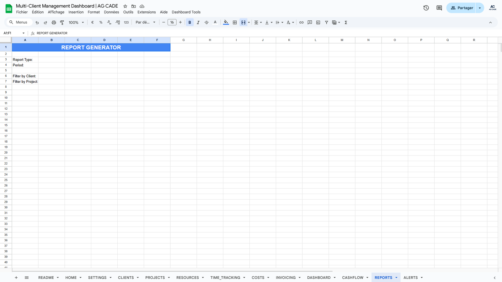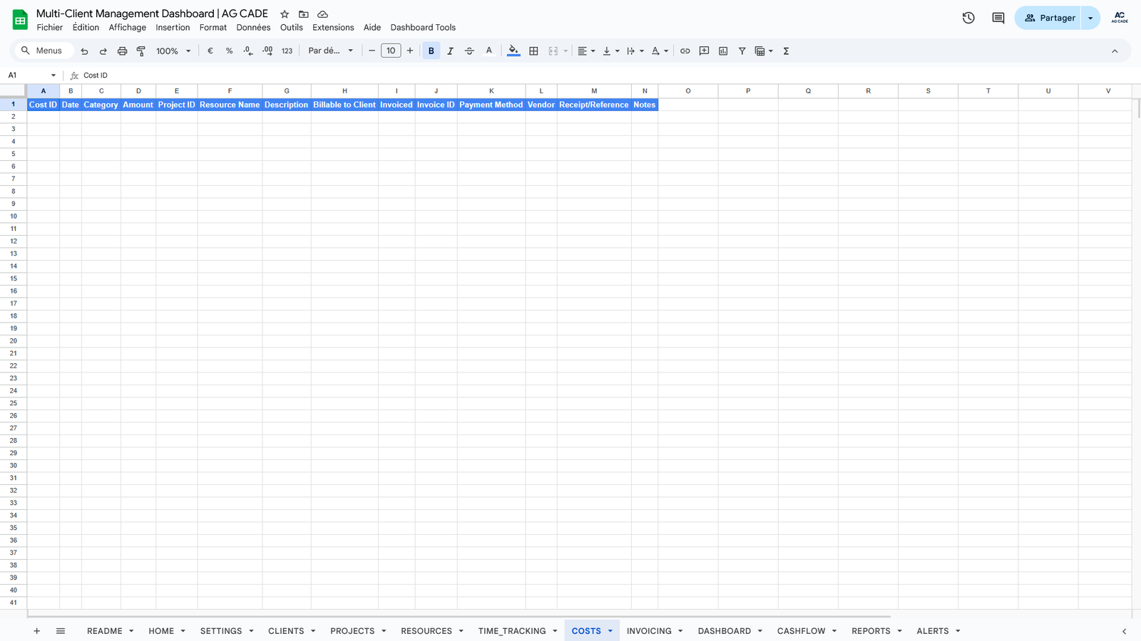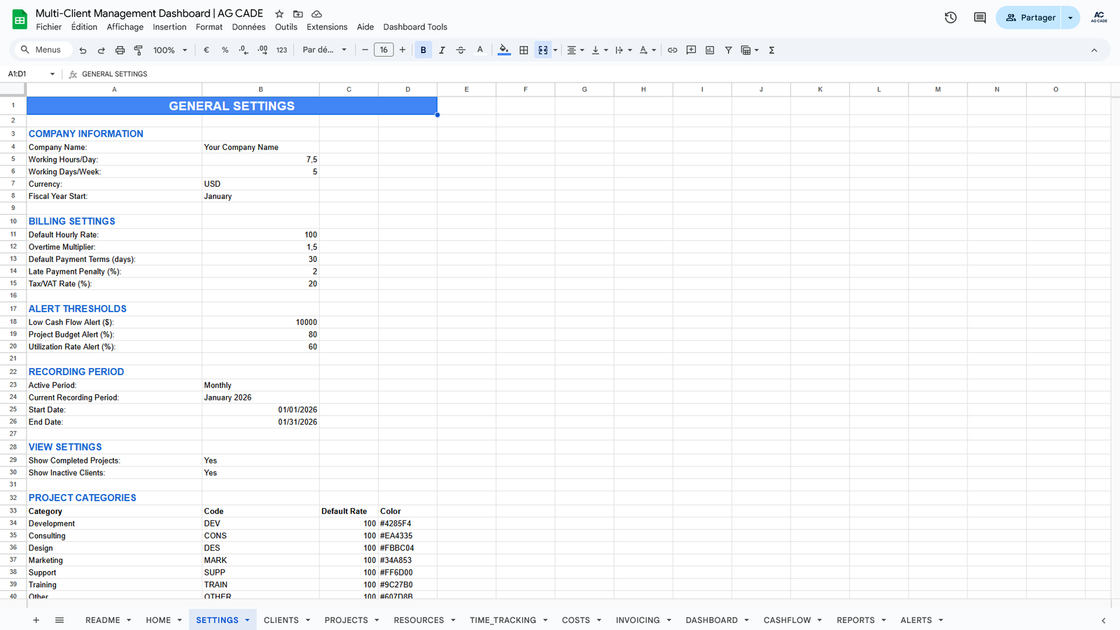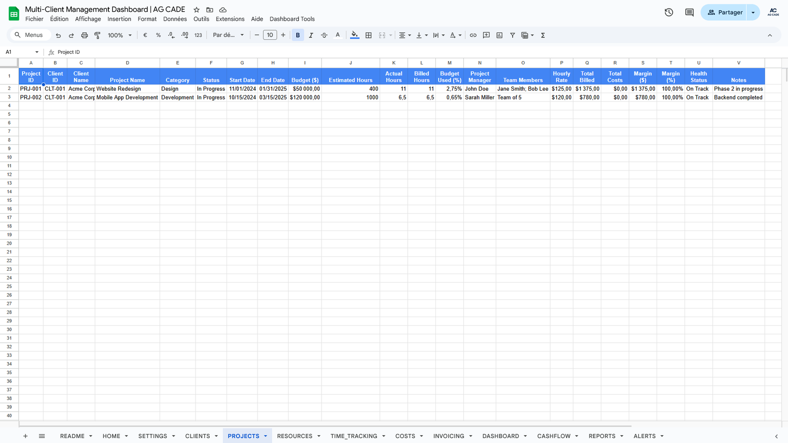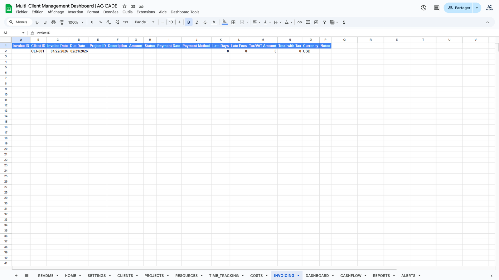 Complete business management system for agencies and consultants. Track clients, projects, time, invoicing, and cash flow - all automated in Google Sheets.